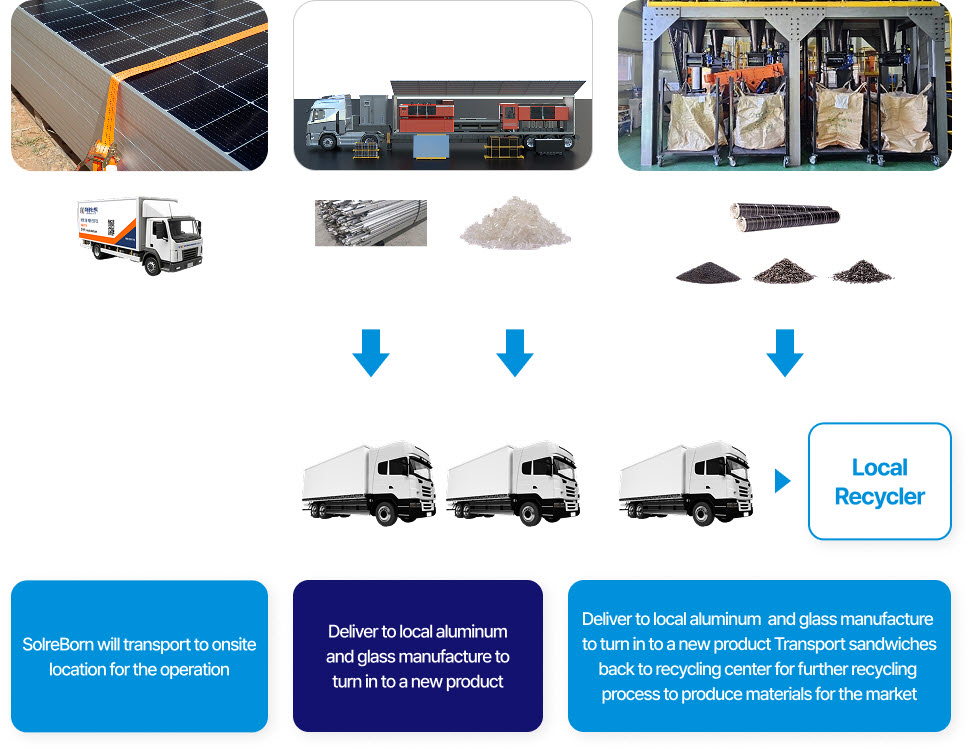 SolreBornwill bring recycling machine onsite to pre-process solar panels, in order to bring down carbon foot print and cost for customers Solar panel recycling done right way now on mobile.